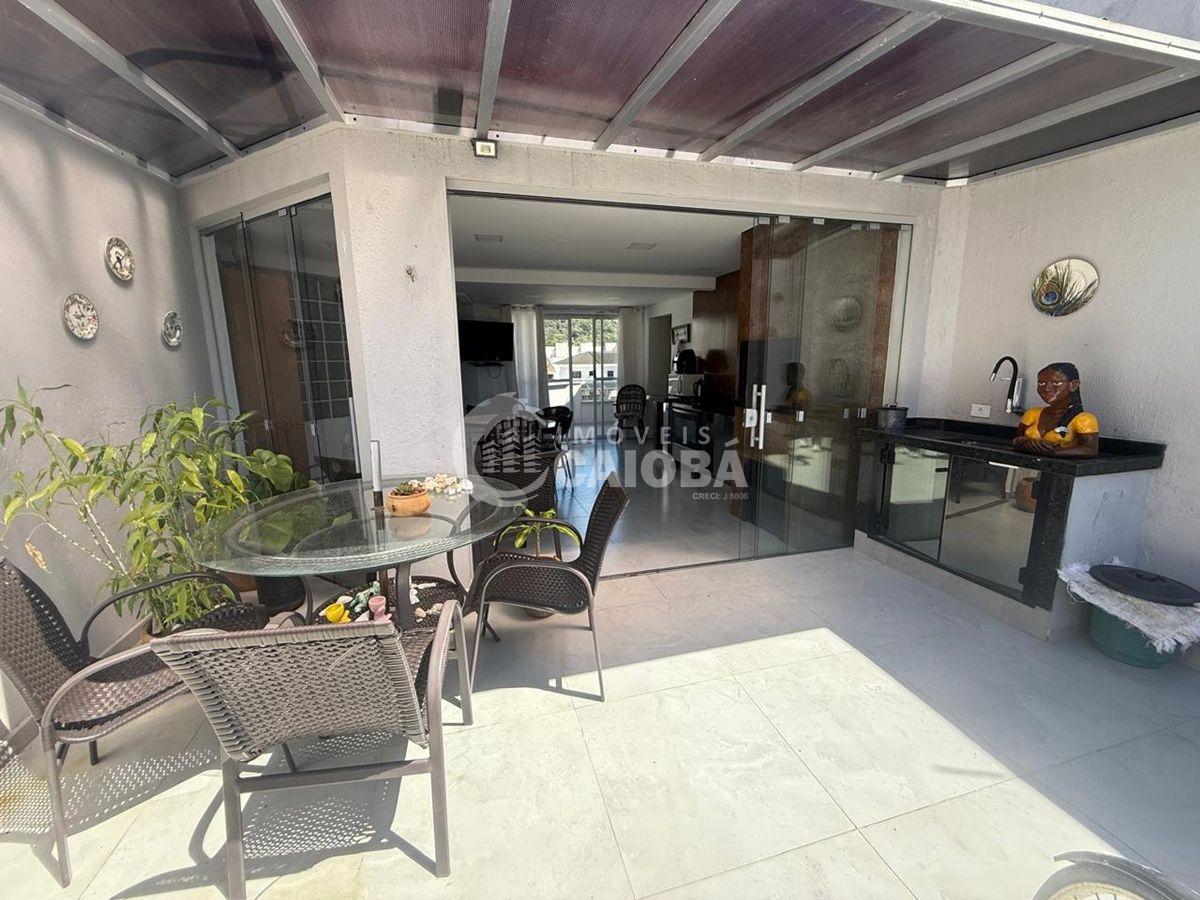 Cozinha e área gourmet integradas, com amplo espaço e sacada